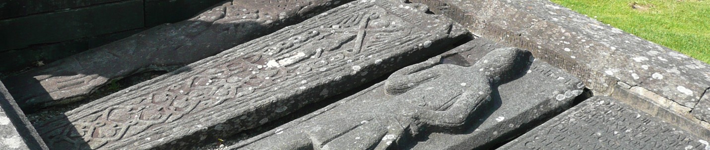 Funerary monuments took a diversity of forms: the most common are recumbent graveslabs. These can bear a range of motifs, commonly, a cross standing upon a stepped ‘calvary’ base. Swords, shears, axes and agricultural implements such as the sock and coulter of the plough are often found.